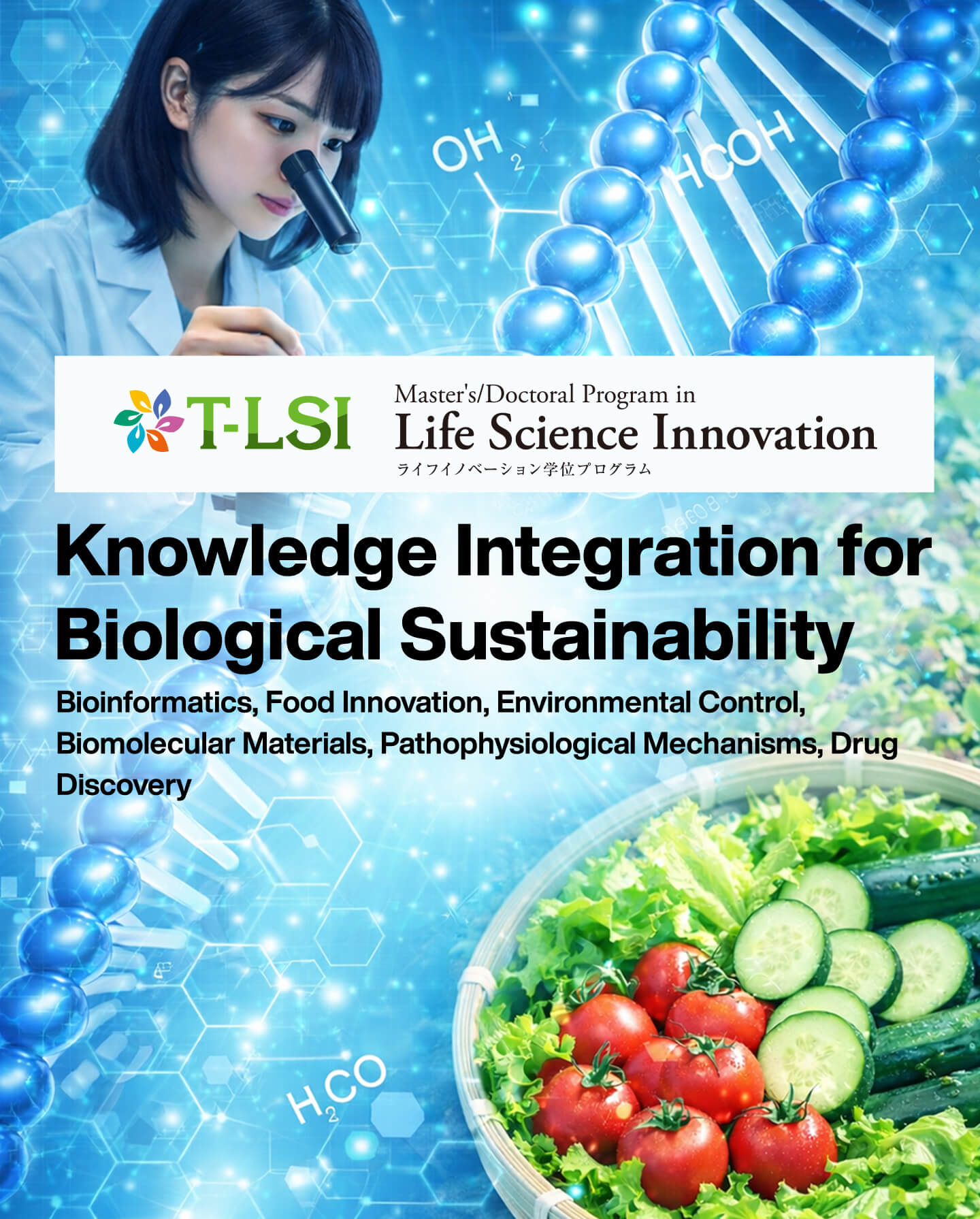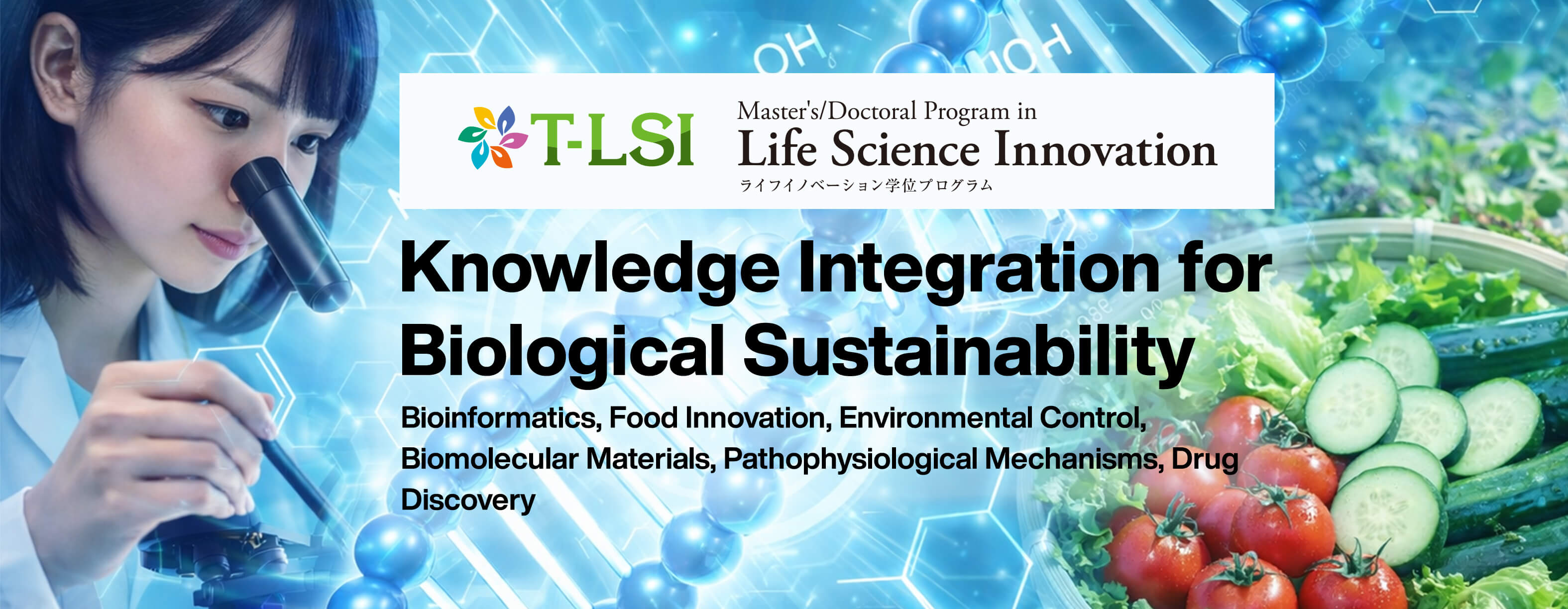 The program cultivates highly specialized professionals and research support personnel who acquire interdisciplinary and comprehensive perspectives related to innovation in the life sciences, and who can contribute internationally in fields such as bioinformatics, bioresources, functional materials, medicine, and drug discovery, and generate innovative outcomes in response to societal needs.
